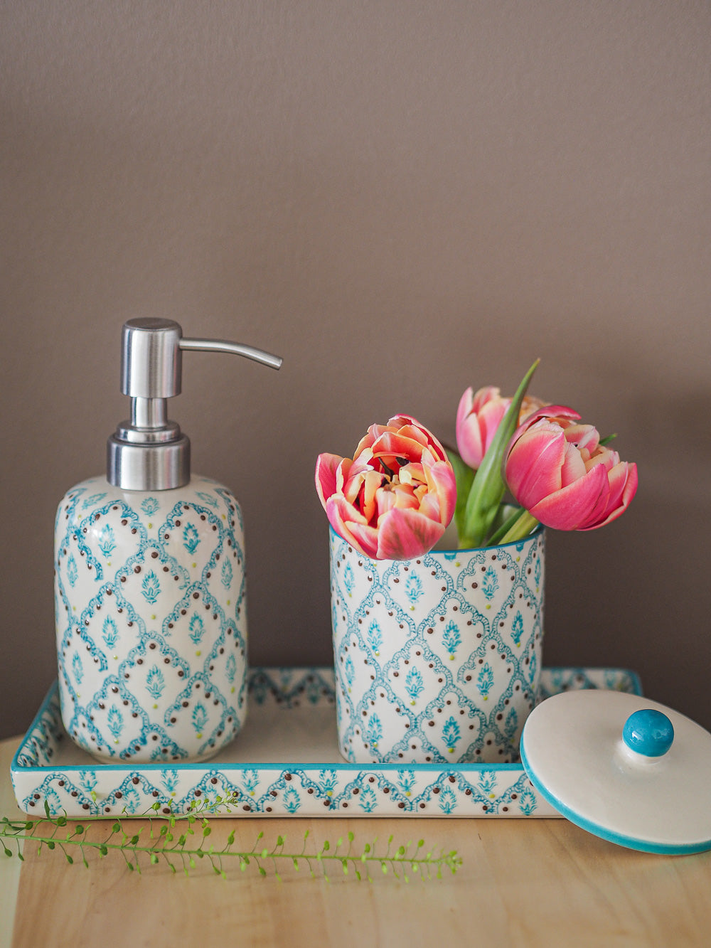 If your bathroom is your small, personal wellness temple, then it is important that it radiates a pleasant and relaxing atmosphere down to the smallest detail. This set with its detailed retro design is sure to be an eye-catcher in your bathroom. Jed's set is unique and individually designed as the prints are applied by hand. This makes each product unique and gives your bathroom a personal touch.