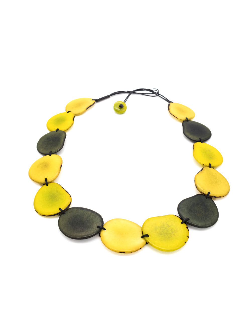 Die Tagua-Nuss ist der Samen einer Palme, die in den tropischen Regenwäldern Südamerikas zu Hause ist. „Phytelephasmacrocarpa“ ist der wissenschaftliche Name dieser Pflanze, was abgeleitet soviel wie pflanzliches Elfenbein bedeutet. Die Konsistenz, das Aussehen der Tagua und ihr cremeweißer Farbton sind dem Elfenbein sehr ähnlich. Die Tagua bietet sich daher ideal als tier- und umweltfreundlicher Ersatz für tierisches Elfenbein an. Auch überrascht das leichte Gewicht der verarbeiteten Steinnuss und durch seine anschmiegsame, warme Struktur lässt sich das Naturmaterial angenehm auf der Haut tragen.