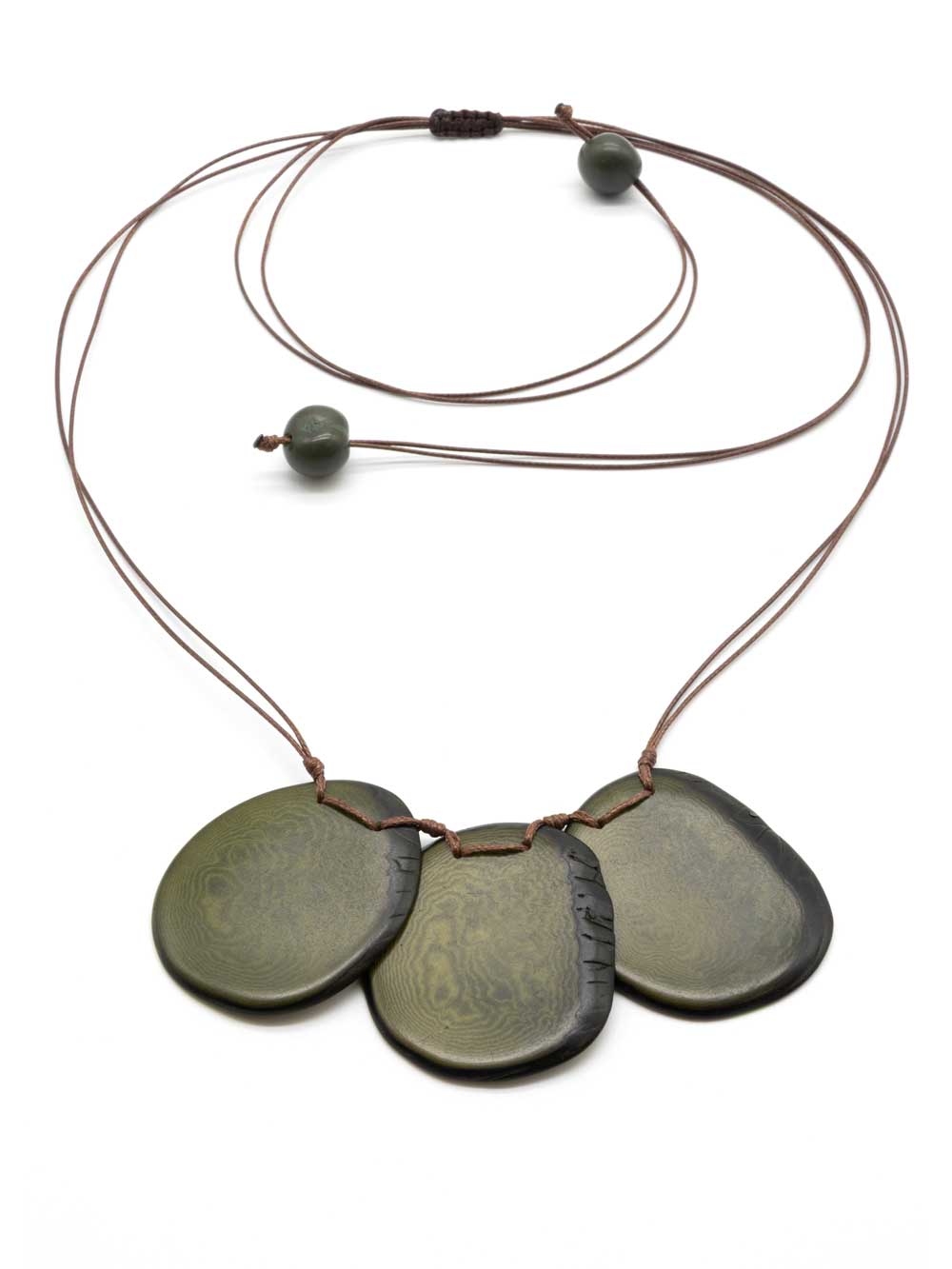 Die Tagua-Nuss ist der Samen einer Palme, die in den tropischen Regenwäldern Südamerikas zu Hause ist. „Phytelephasmacrocarpa“ ist der wissenschaftliche Name dieser Pflanze, was abgeleitet soviel wie pflanzliches Elfenbein bedeutet. Die Konsistenz, das Aussehen der Tagua und ihr cremeweißer Farbton sind dem Elfenbein sehr ähnlich. Die Tagua bietet sich daher ideal als tier- und umweltfreundlicher Ersatz für tierisches Elfenbein an. Auch überrascht das leichte Gewicht der verarbeiteten Steinnuss und durch seine anschmiegsame, warme Struktur lässt sich das Naturmaterial angenehm auf der Haut tragen.