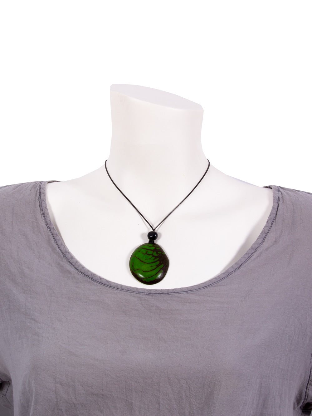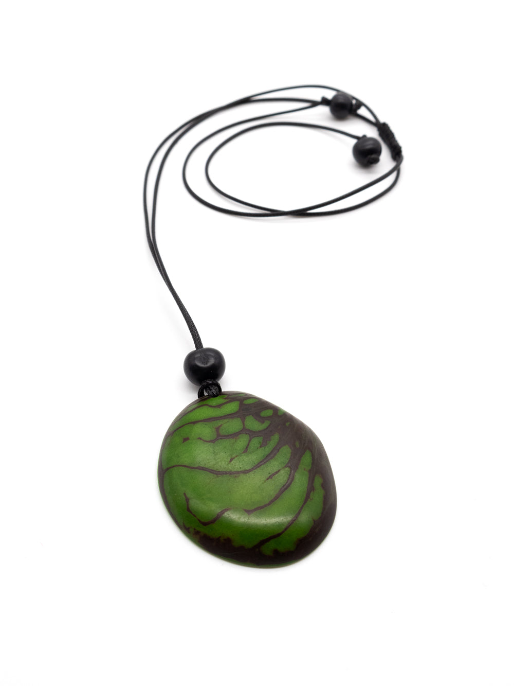 You get an elegant accessory that goes with countless outfits. It is made from the tagua nut and shaped into a very individual piece with a fashionable look. Each necklace is unique due to the different structures of the raw material. Your necklace may vary a little from the product photo.