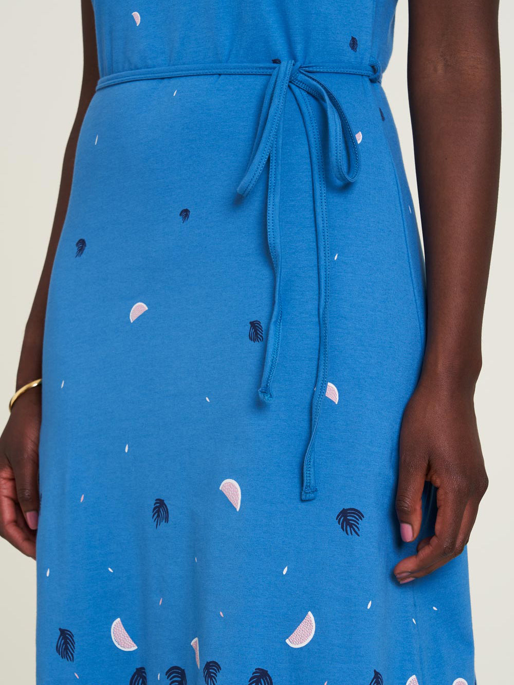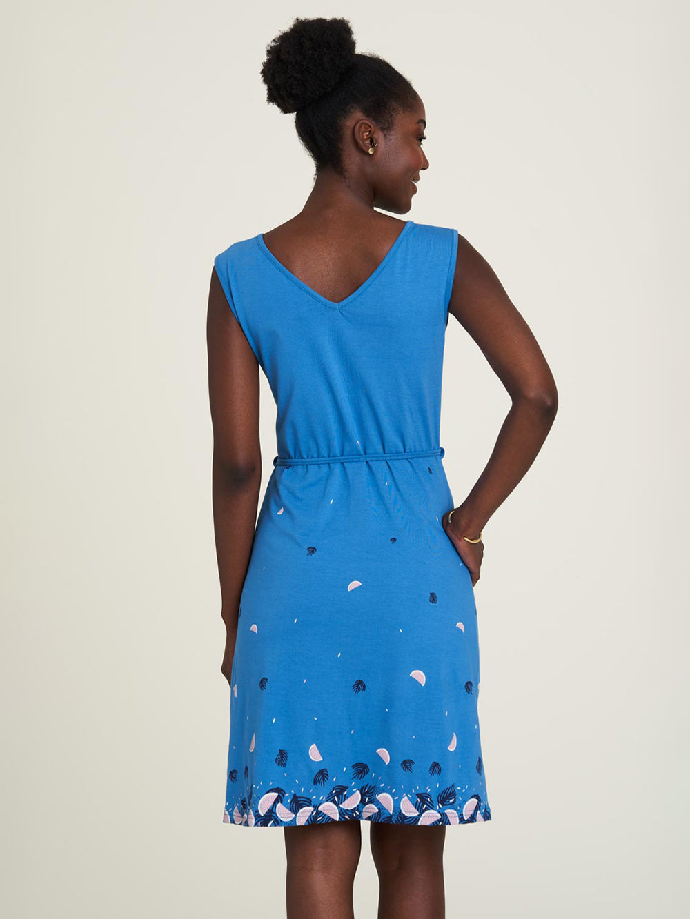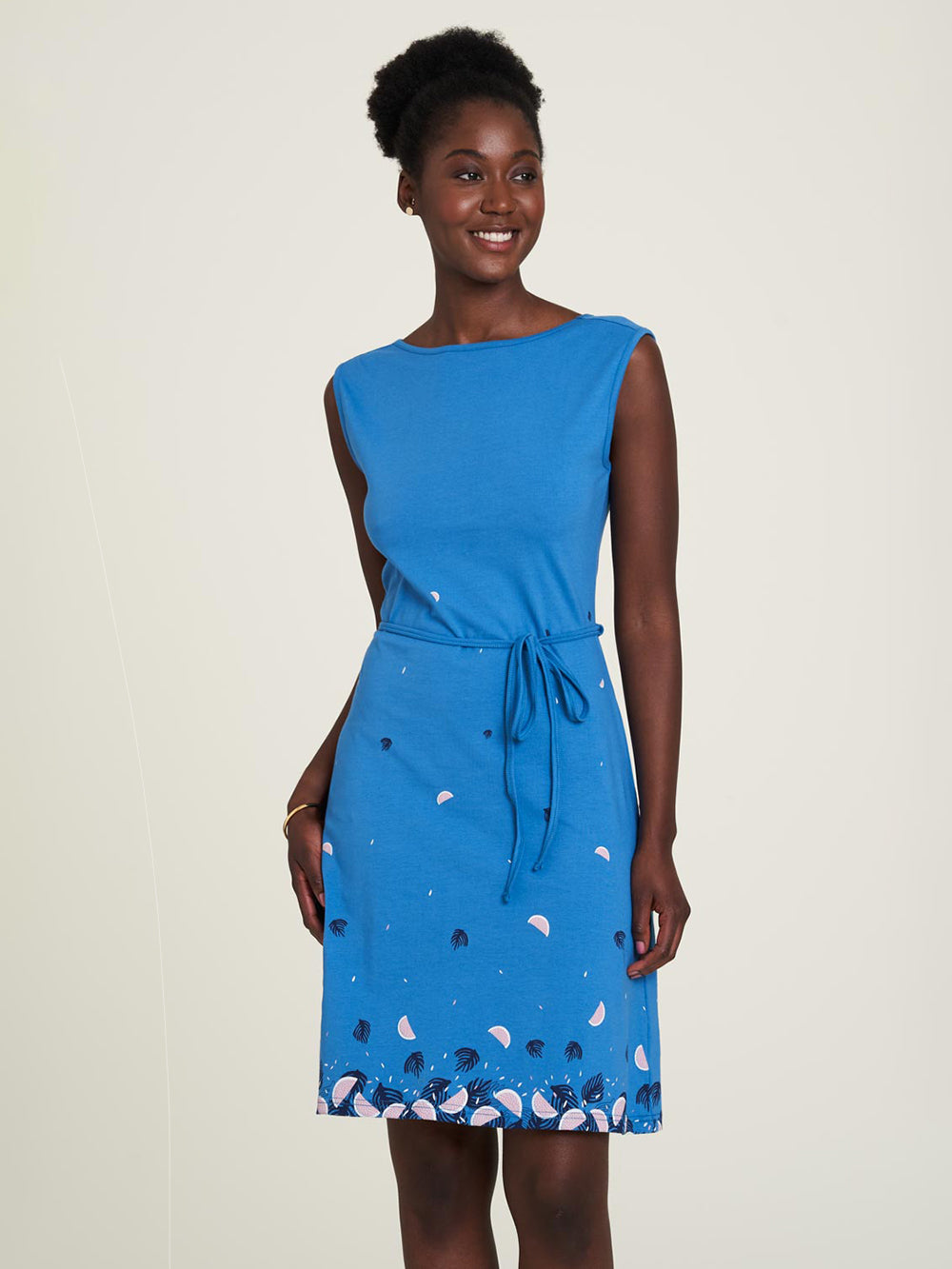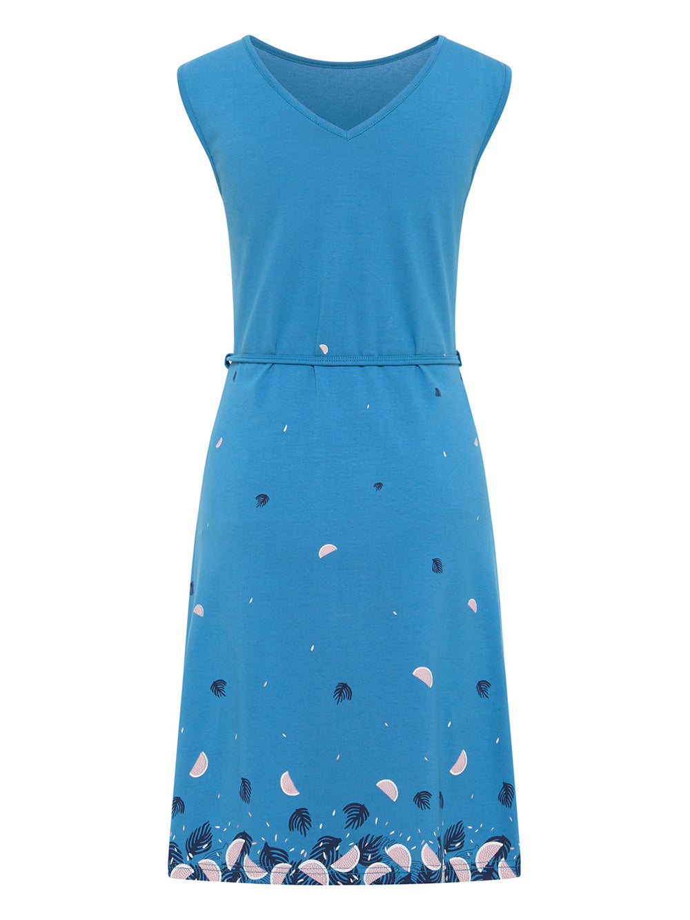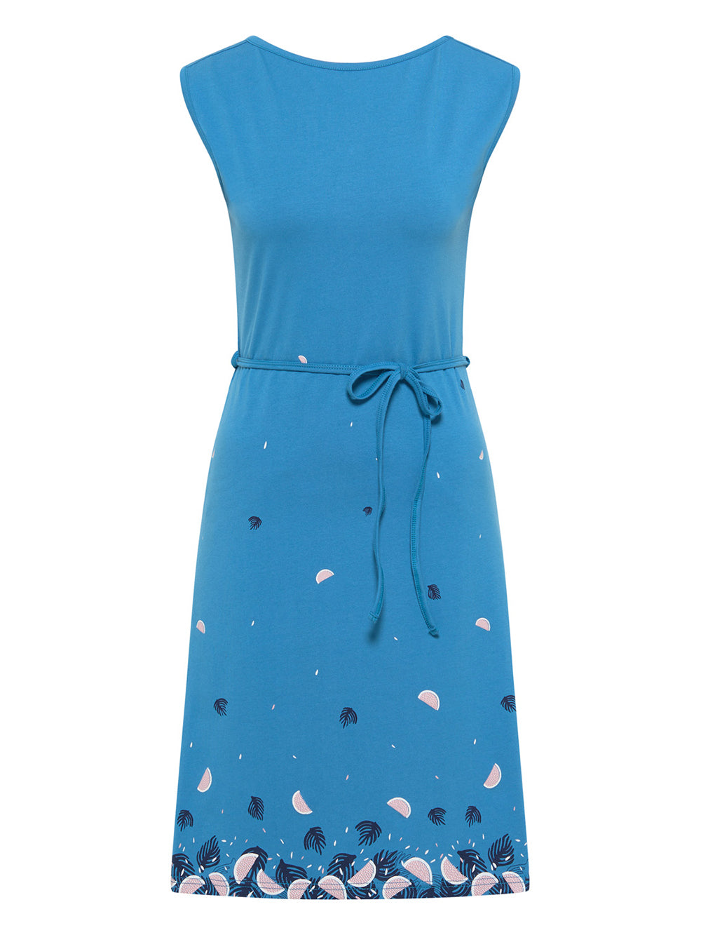 This playful dress with its chic tie band is not only comfortable to wear, but also extremely stylish. The tailored cut and sleeveless design are highlighted by an airy fruit pattern on soft material. A special detail is the gentle round neckline, which merges into a V-neckline at the back. The strong colors give the dress a lively touch and ensure a good mood in everyday life.