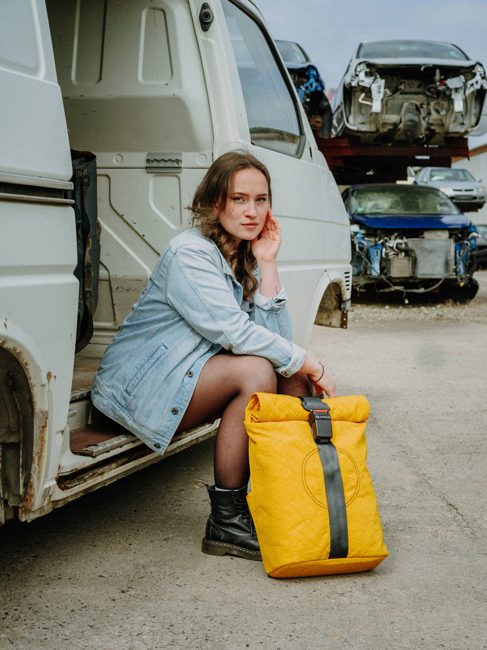 MATÉRIEL: Forte proportion de plus de 85% de matériaux upcyclés : airbag (tissu nylon PA 6.6), ceintures de sécurité, boucle de ceinture. 15% sont des matériaux conventionnels tels que : Par exemple, fils, fermetures éclair, rubans, rembourrage, doublures et ajusteurs pour les bretelles.