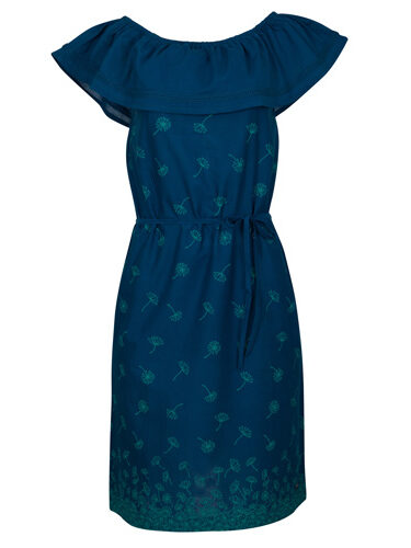 Cette robe d'été romantique sera certainement votre nouvelle pièce préférée, pas seulement si vous aimez les pissenlits ! Le col à volants bordé de dentelle peut être porté sur les épaules ou hors de l'épaule. Le tissu est merveilleusement léger et rend la robe d'été incroyablement agréable à porter. La robe est légèrement évasée et possède une ceinture en tissu à la taille.