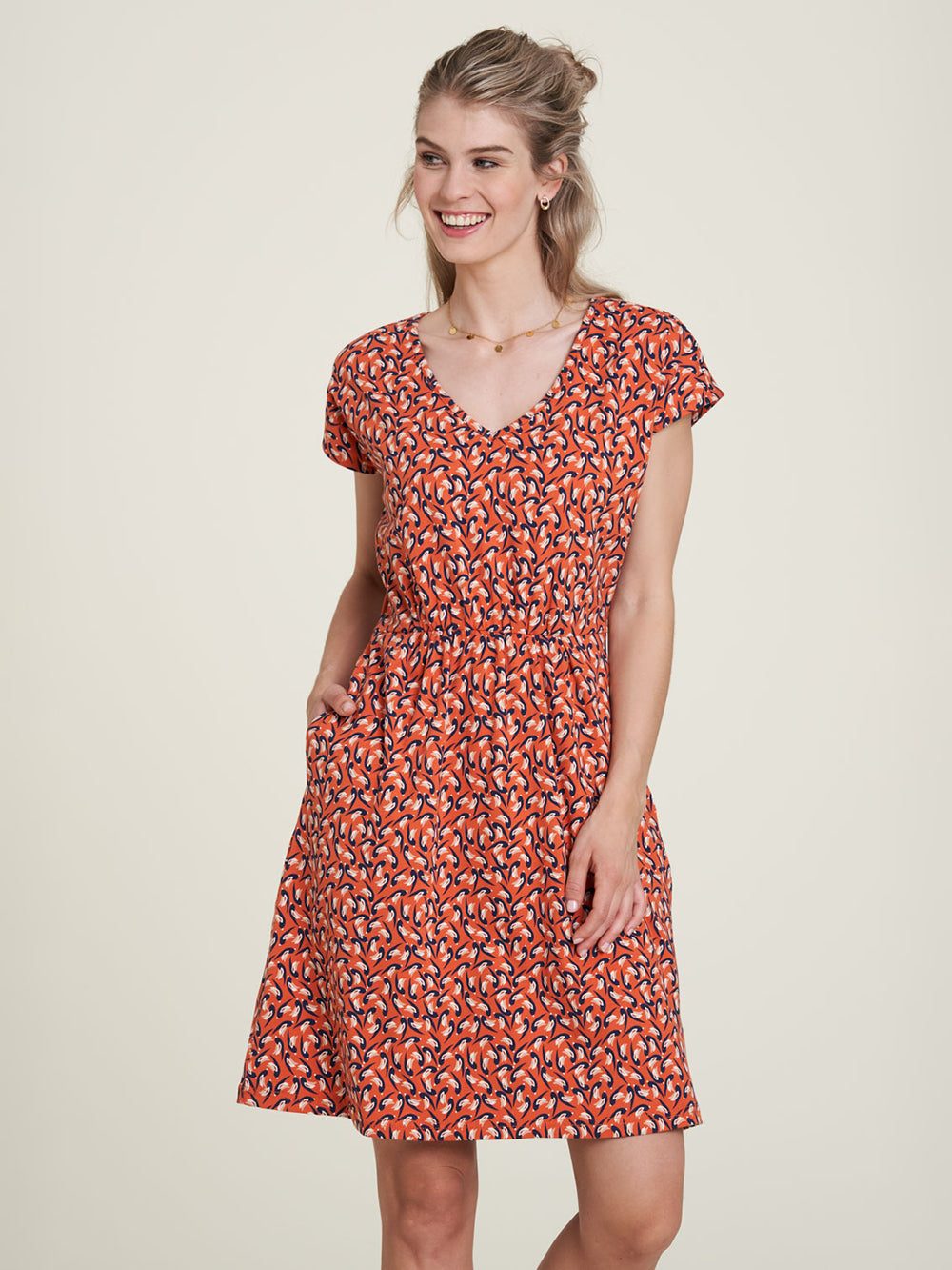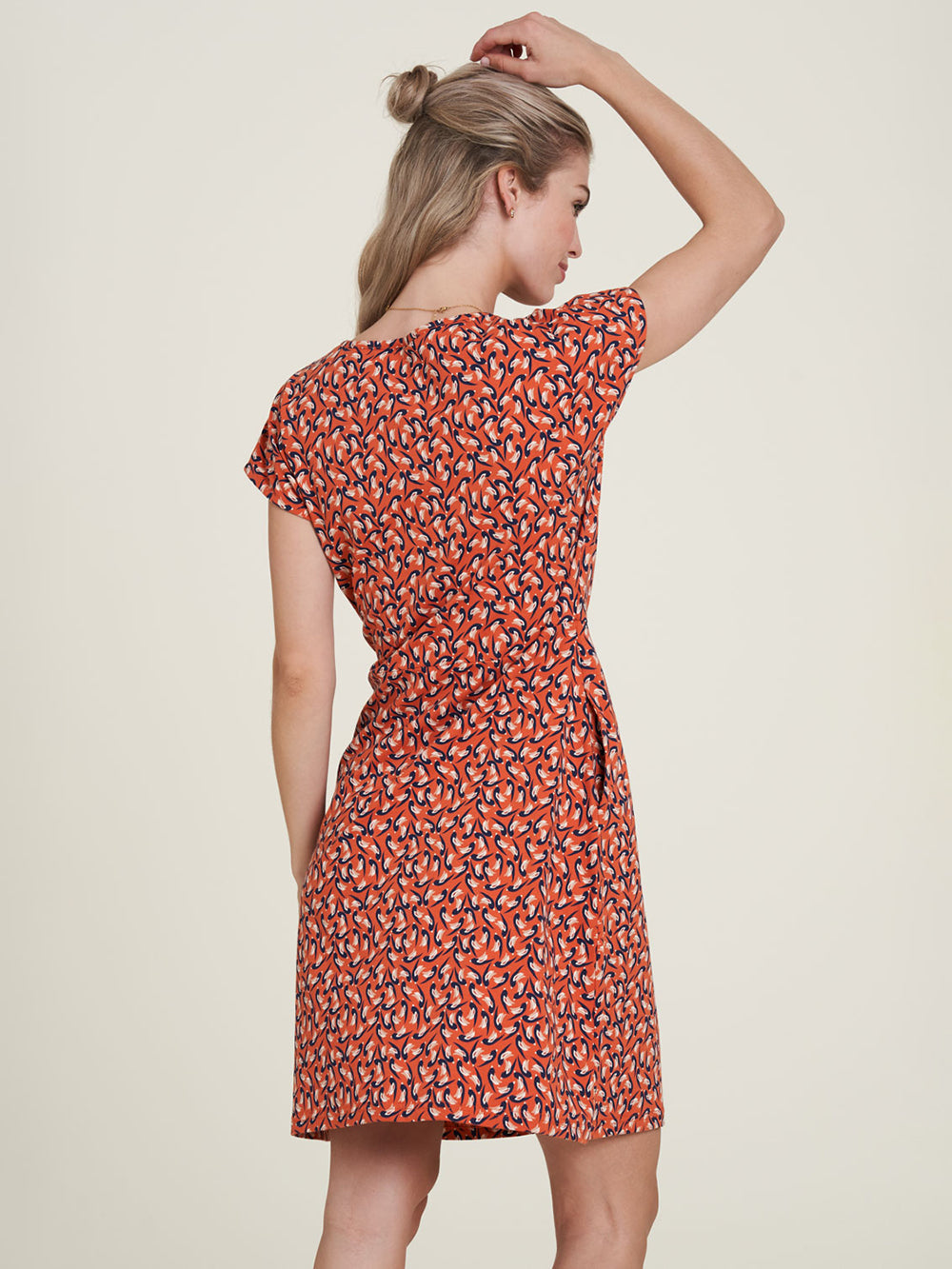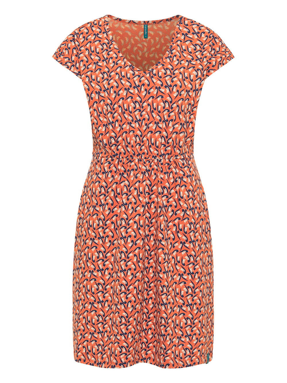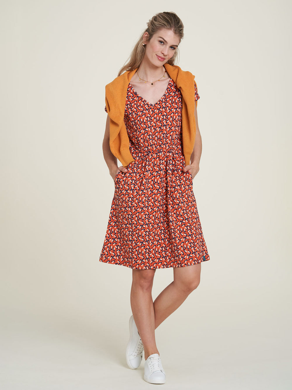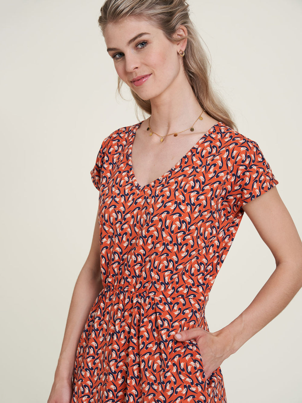 Mit seinen knappen Ärmeln und dem leichten Stoff ist dieses Kleid genau das Richtige für einen sonnigen Tag im Sommer. Sein reizender V-Ausschnitt betont deine Figur ebenso vorteilhaft wie der taillierte Schnitt. Das atmungsaktive und luftige Material umspielt deine Beine. Kombiniere dieses Sommerkleid hervorragend mit einer unserer populären Strickjacken.